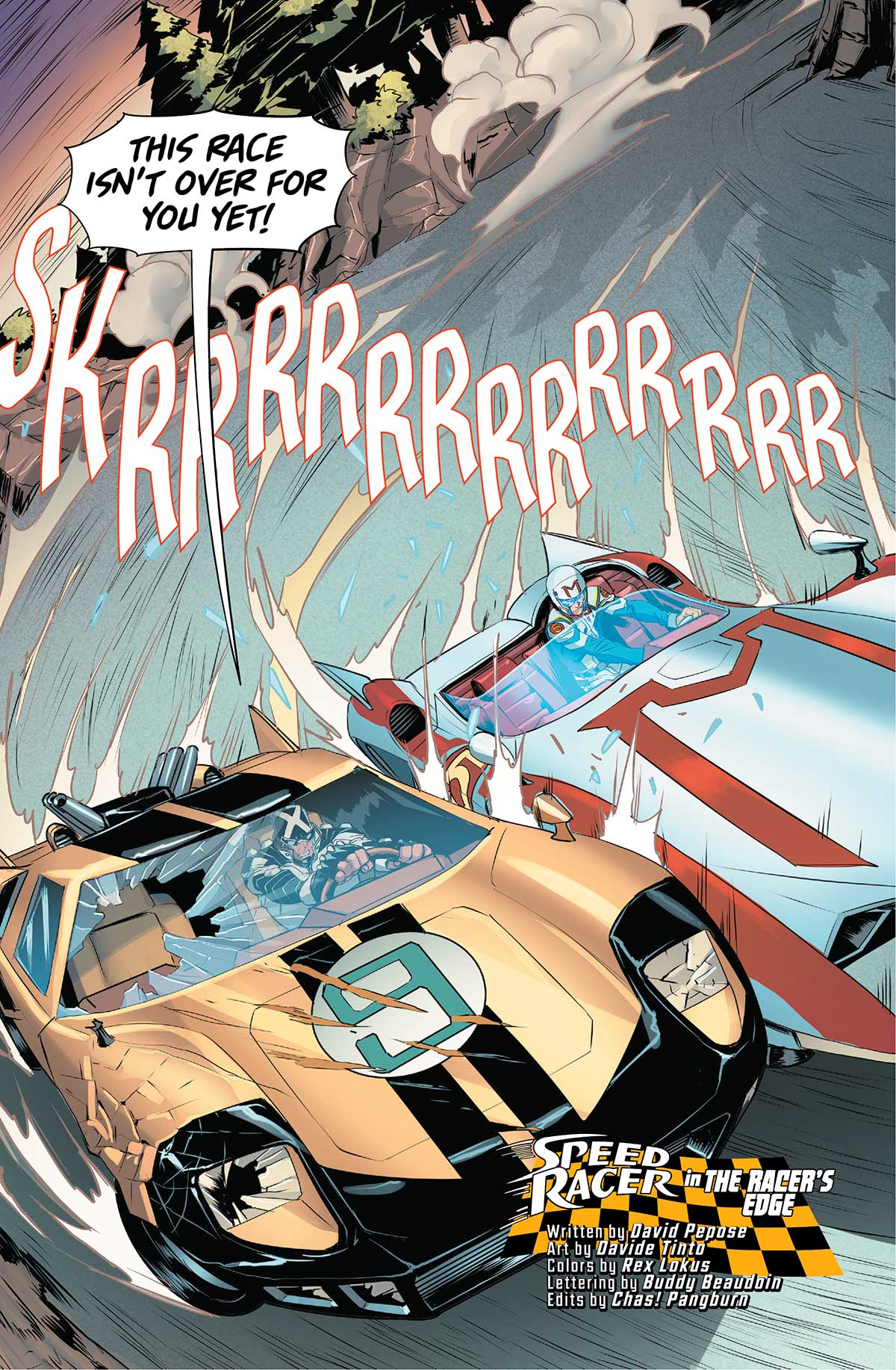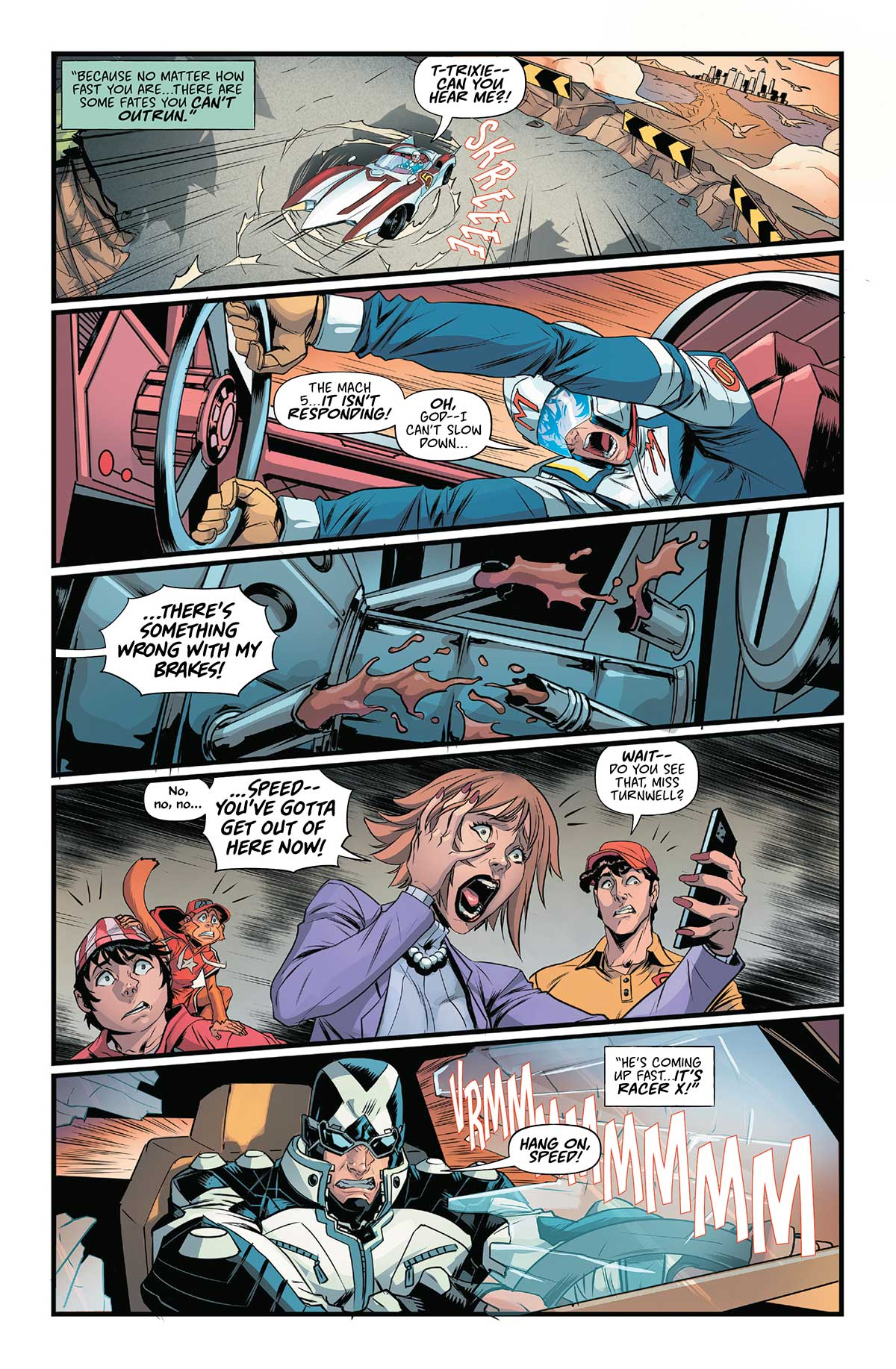 The issue picks up right in the heat of the action at the Great Alpine Racetrack. It’s a dead heat between Speed Racer and the ruthless Kim Jugger, but the stakes are rigged. Dante Ferno and Alpha Automotive have sabotaged the Mach 5 back in issue #4, leading to a terrifying realization for Speed: his brakes are gone!