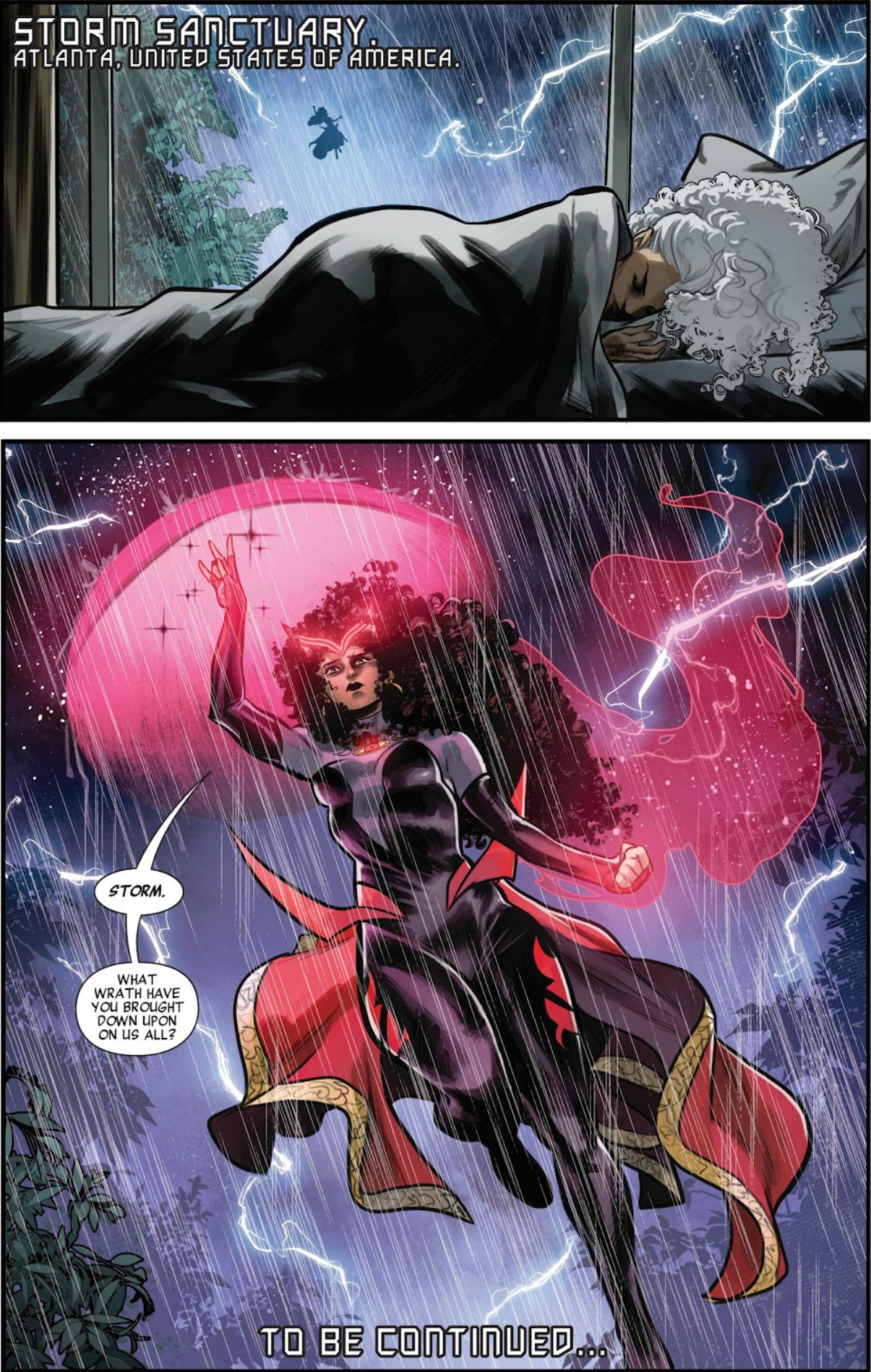 To the issue’s credit, the story dwells on what it is like for Storm to fail. She is ineffective in the face of the attack on the French town, leading to the death of hundreds of people. And the guilt and shame of that failure is made clear. Unfortunately, this is all the interiority we are given, and the only truly grounded moment thus far. While it is not unreasonable for a Storm series to explore the divine, a key issue that has plagued Murewa Ayodele’s Storm writings thus far has been the inability to embrace a tone and a scale that feel more congruent with the character readers have known for decades. The grandiosity can be entertaining, but it feels hollow and shallow, and very unlike the character Chris Claremont established. Even far removed from the character Al Ewing wrote in X-Men Red during the Krakoa era.