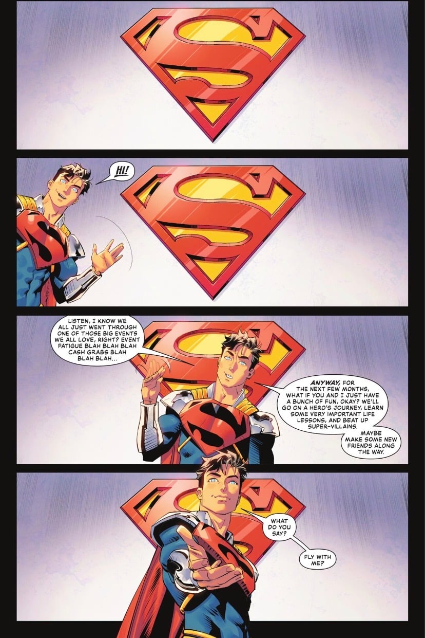 Superboy Prime has had a complicated history in the comics. He was in a world much like ours, was a huge comic nerd who happened to look like Clark Kent, got powers, came over to the DC universe, lost HIS universe, punched reality a bunch of times (you’re welcome, Jason Todd), and has ping ponged between good, bad, and every morality in between. It’s a history that is hard to ignore, and Williamson is not afraid to wear it on his sleeve.