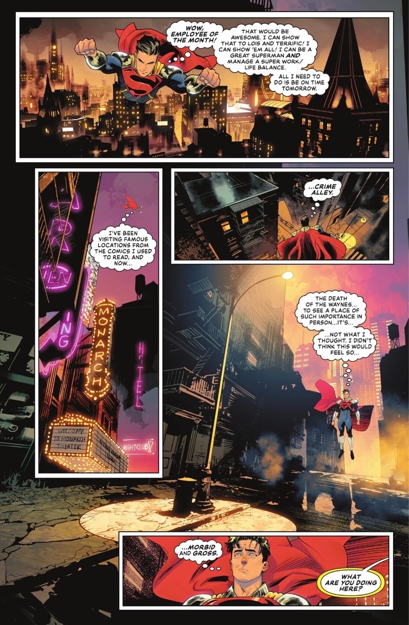 The issue starts with Superboy-Prime visiting none other than the Kents. Though he’s having a blast exploring all the corners of the DC Universe he never has and fighting off baddies, he feels the weight of his own history. Members of the Justice League watch his every movement, waiting for him to slip up or show his darker side again. That’s the part of himself he’s just wanting to move past. But how can he move on if it’s all anyone ever sees him as? The Kents being… well the Kents, they can’t help but try to give him support and a listening ear.