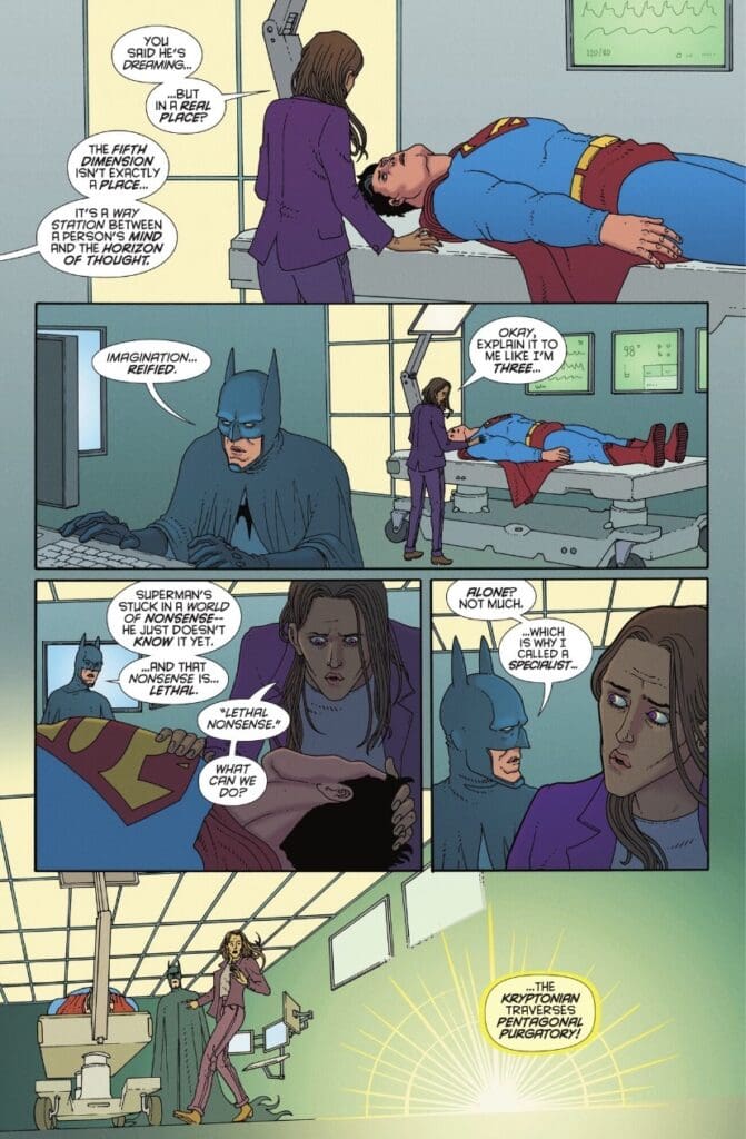 Meanwhile, back in Metropolis, a severely desperate and totally out-of-his-element Batman is forced to consult with Doctor Fate to save his best friend, whose mind is rapidly failing under the weight of pure “illogic.” The only solution? Batman has to plunge into the Fifth Dimension himself. This raises the stakes beautifully, grounding the magical chaos in the strong, familiar bond between the World’s Finest. Batman’s solution is perfect: he reveals his own cerebral safety net, which is, of course, the mischievous Bat-Mite.