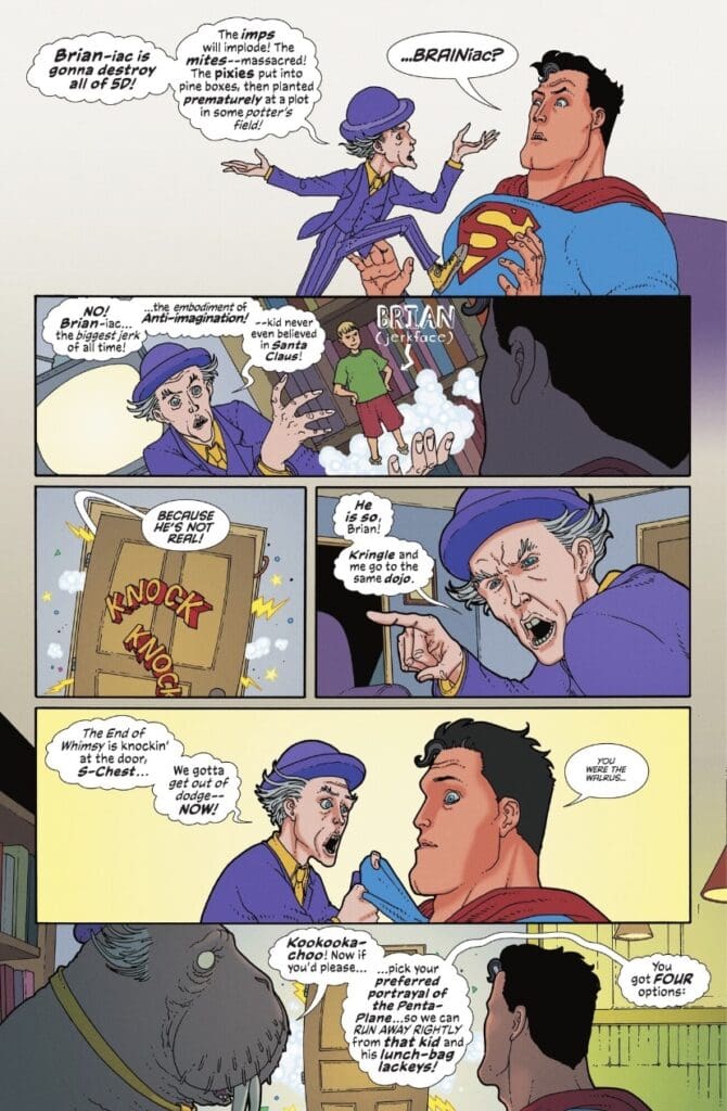 Once inside, they learn that all the chaos traces back to the villain of anti-imagination, Brian-iac, who believes that imagination is a hurtful lie. To win the day, Superman taps into his greatest powersets (hope, optimism, and a pen) and scribbles his own 5D familiar, the ridiculously cute, rainbow-curled Kal-Elf, into existence! The incredible team of Mxyzptlk, Bat-Mite, and Kal-Elf defeats Brian-iac in a glorious explosion of creativity, reminding us that belief and imagination are the ultimate weapons in the war for reality. It’s honestly a hilarious and intensely clever read, and one I’m sure readers will revisit over and over again. I mean, Kal-Elf is finally here!