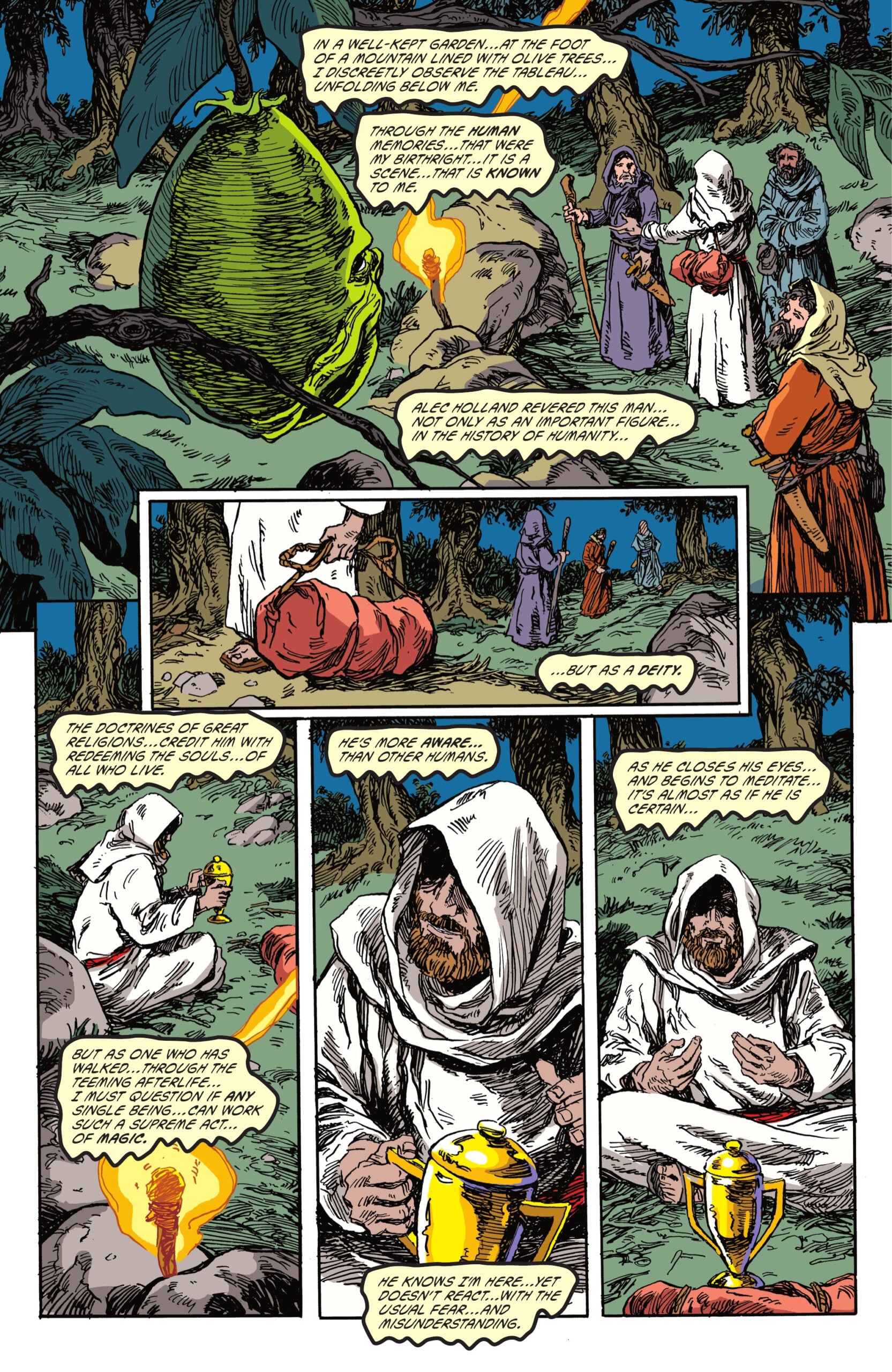 The story picks up with Alec Holland in a bit of a temporal drift. He’s essentially bouncing through different eras of reality before landing squarely in the Garden of Gethsemane. There, he finds the Nazarene meditating just before the events of the crucifixion. What really struck me about this whole series was the decision to describe Jesus as a “magician.” It’s hard to articulate why, but it just works in the context of this weird, mystical world that is the DC Universe. What’s even cooler is that, unlike everyone else Swamp Thing encounters, this man isn’t fazed at all. He knows the elemental is there, watching from the shadows, and he’s totally at peace with it.