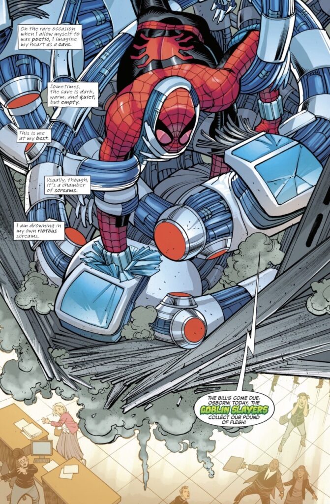 Unfortunately, we don’t just focus on Norman. This issue juggles Aunt May confronting a rude receptionist, Ben Reilly and Janine bailing on Peter’s life, Peter’s childhood friend Brian Nehring being carted off to the hospital, the extended Spider-Family joining Norman’s fight, and Roderick Kingsley rubbing elbows with a secret society. It’s exhausting.