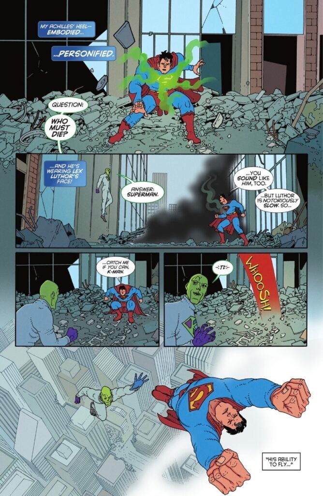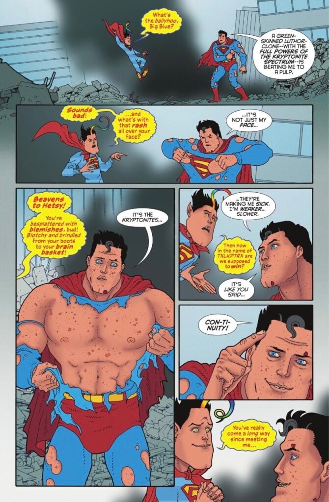 As Superman takes a literal and metaphorical beating, the narrative fractures. We see him pummeled by Lex Luthor in a giant power suit while being bombarded with a spectrum of Kryptonite effects we’ve seen over the last four issues. The arrival of Batman and friends provides a brief tactical reprieve, but the real battle is happening inside Clark’s body.