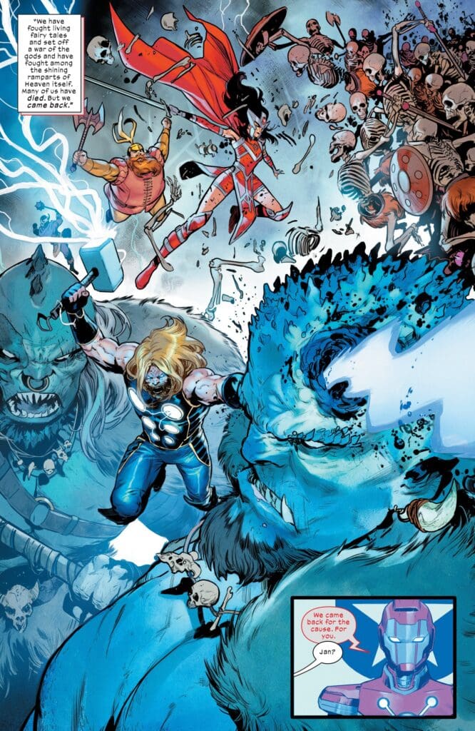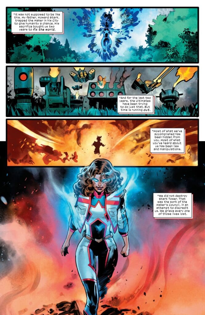 While Tony speaks, we see the results of the Ultimates’ work. We see Luke Cage leading prisoner uprisings. We see stockpiles of medicine being distributed to the sick. We see the team breaking the infrastructure. It culminates in a chilling, powerful “open invitation.” Tony isn’t just asking for support; he is deputizing the entire human race.