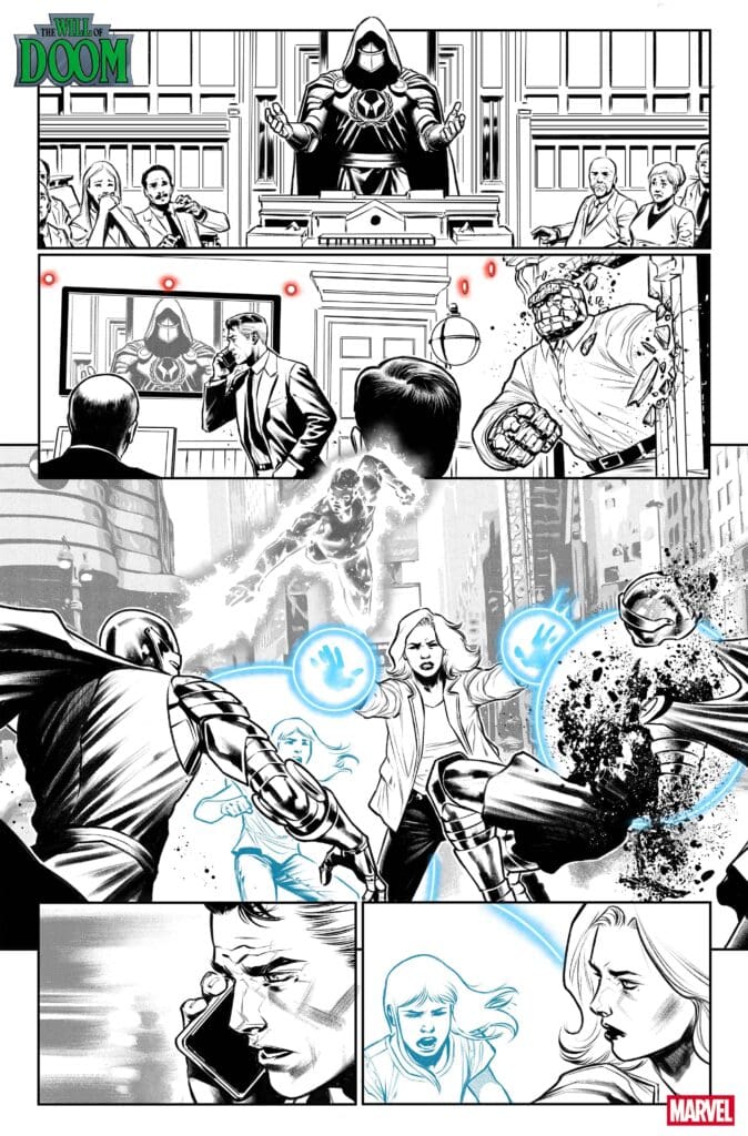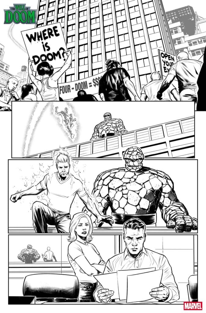 The preview teases a world in turmoil. Outside the Baxter Building, protesters demand answers about Doom’s disappearance, while inside, Sue and Reed Richards of the Fantastic Four are left to sort through his affairs.