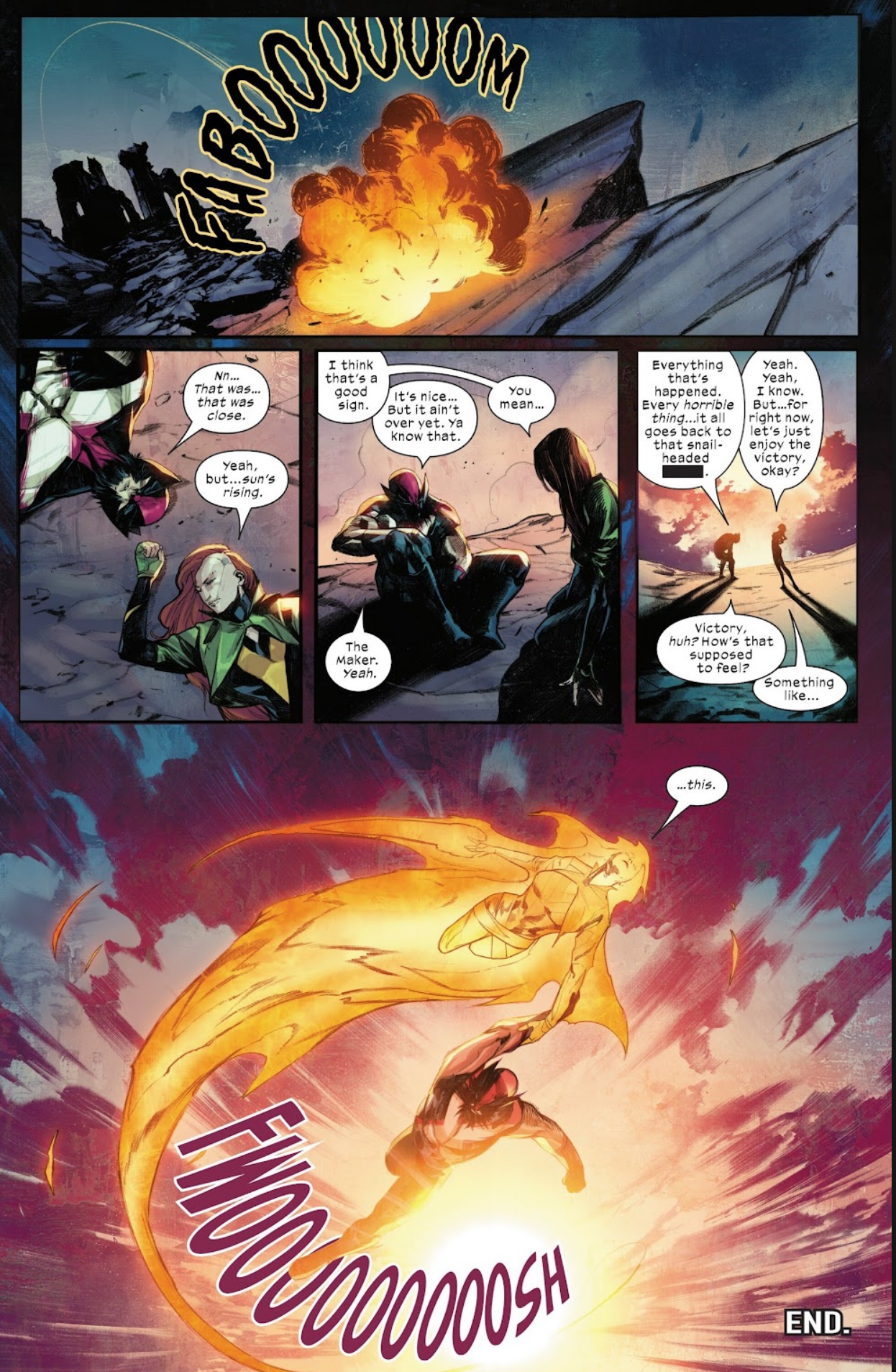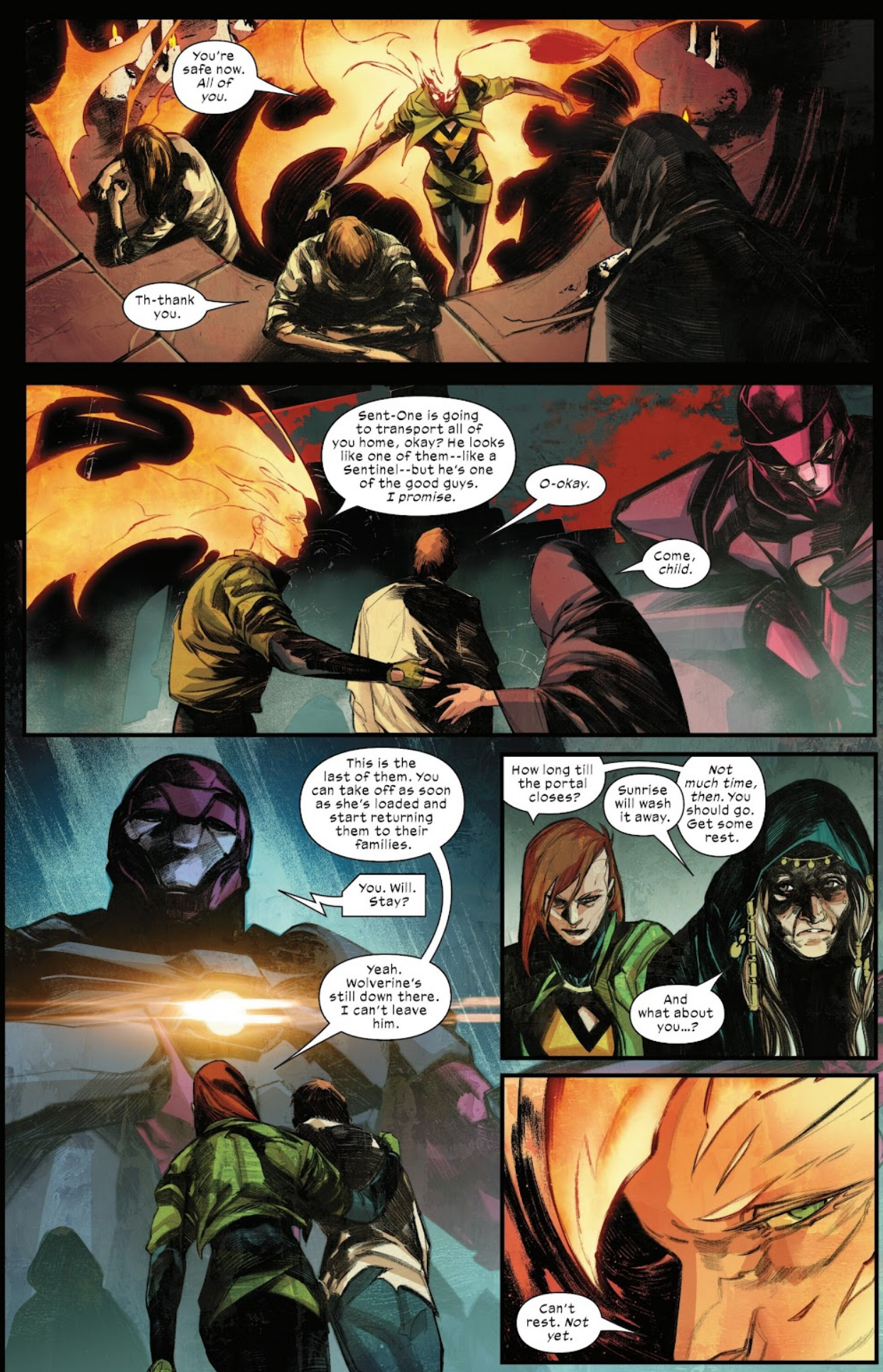 Phoenix quickly pulls Wolverine out of Limbo, and the two are left to contemplate the future. The Maker is the biggest threat, but for now, the two can enjoy victory. Phoenix triumphantly lifts Wolverine into the air, and they fly around in brief, but genuine relief and joy.