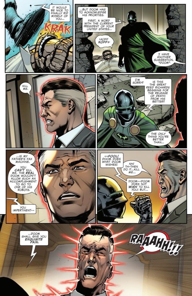 Zdarsky’s script shines when it focuses on the deteriorating relationship between Earth’s heroes and the governments they serve. Secretary Brooke of the State Department delivers a scathing reality check to Reed Richards, accusing him of either being too arrogant to see Doom’s takeover coming or thinking he could “cowboy it” himself without telling authority.