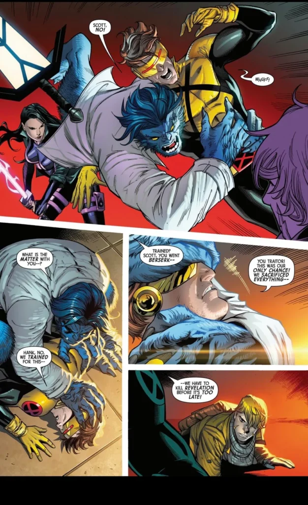 X-Men #23 shows us what was going on while the Age of Revelation, future Cyclops was in the present version’s body. His plan to kill Doug was foiled by Beast, who was not taken over by the Age of Revelation Beast, building off the stunning twist at the end of the Finale issue last week. The issue follows the persistence of future Cyclops, aiming to take down Doug no matter what assurances Doug provides that he doesn’t want to go down such a dark path. Cyclops’ dogmatic insistence that Doug dies leads Bei, Doug’s wife, and him to sit down to talk, with Bei feeling that it was a mistake to even come here. Outside, they face threats from ONE, but as Doug says himself, taking on assassins from ONE and assassins from the future is easier than taking on Cyclops.
