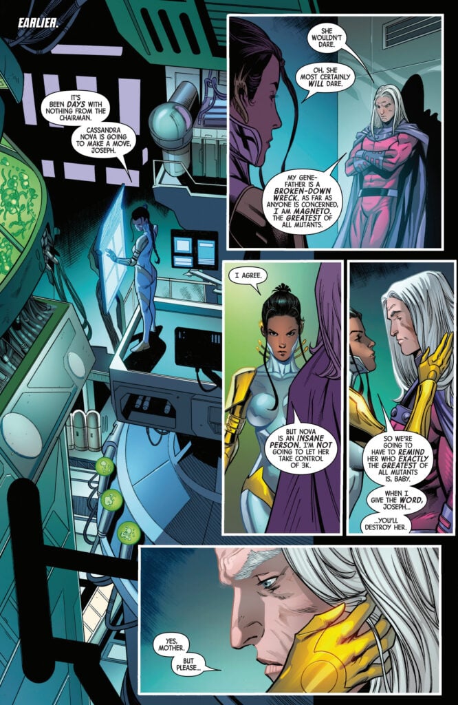 With the Chairman absent for the past week, while the Age of Revelation took place, 3K has reached a boiling point. Never an organization that seemed to get along well, the leading members are at odds with one another. Cassandra Nova seeks to take power, and the main force standing in her way is Astra, who commands the loyalty of the Magneto clone Joseph. Wyre, the brutal drill sergeant of 3K, stands in the middle, with 3K’s X-Men loyal to him, and able to decide the fate of such a battle.