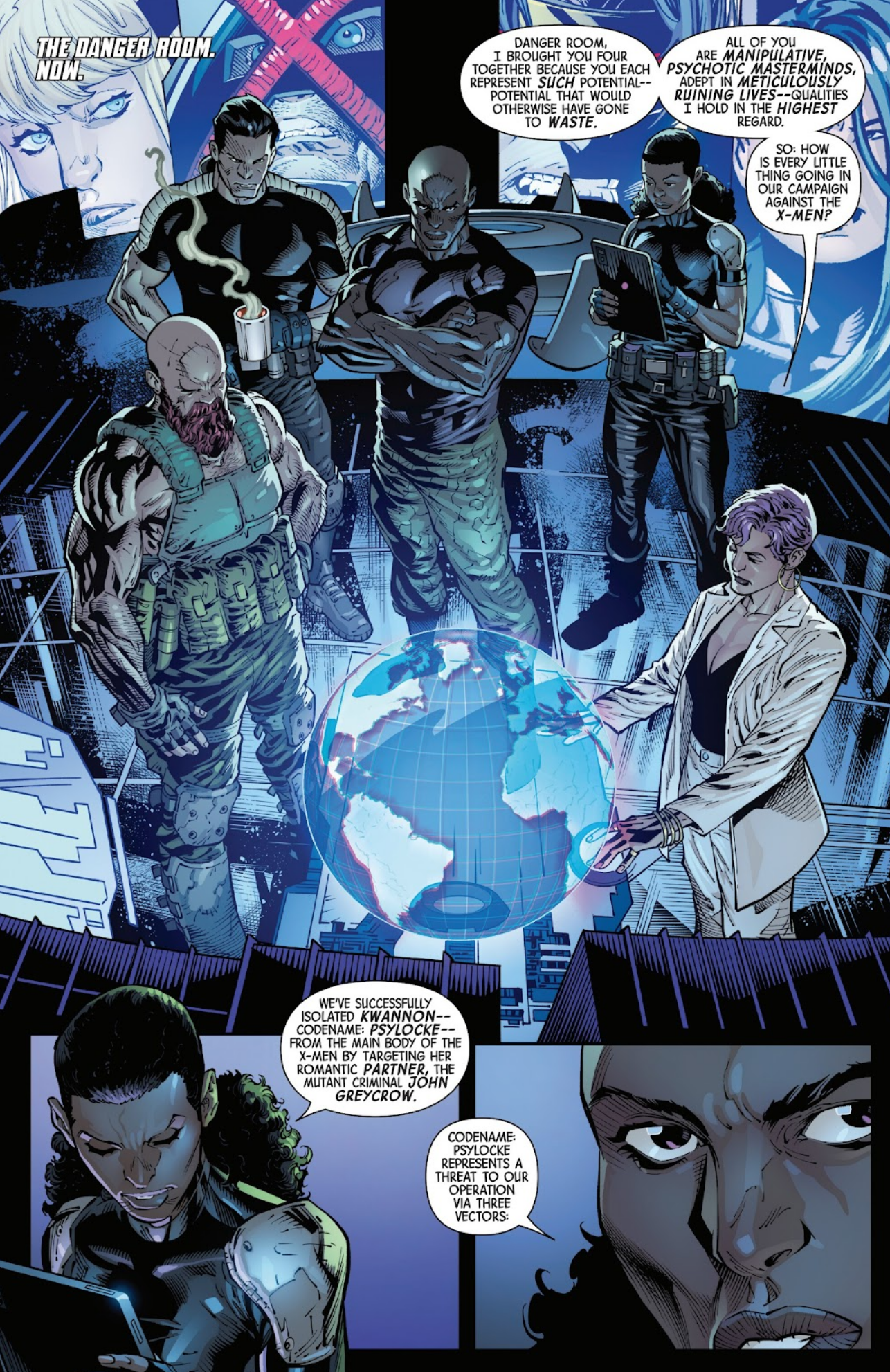 A common thread between the recruits is the complete lack of care for their fellow man, with two members not even believing themselves to be human. A quartet of ruthless strategic experts, Maxine Danger siccs them on the X-Men, trapping the bulk of the X-Men team on a ship that hosts techno-organic organisms designed to kill, while Psylocke and Xorn are waylaid by John Greycrow’s capture, and Glob Herman fights for his life after a deadly ambush.