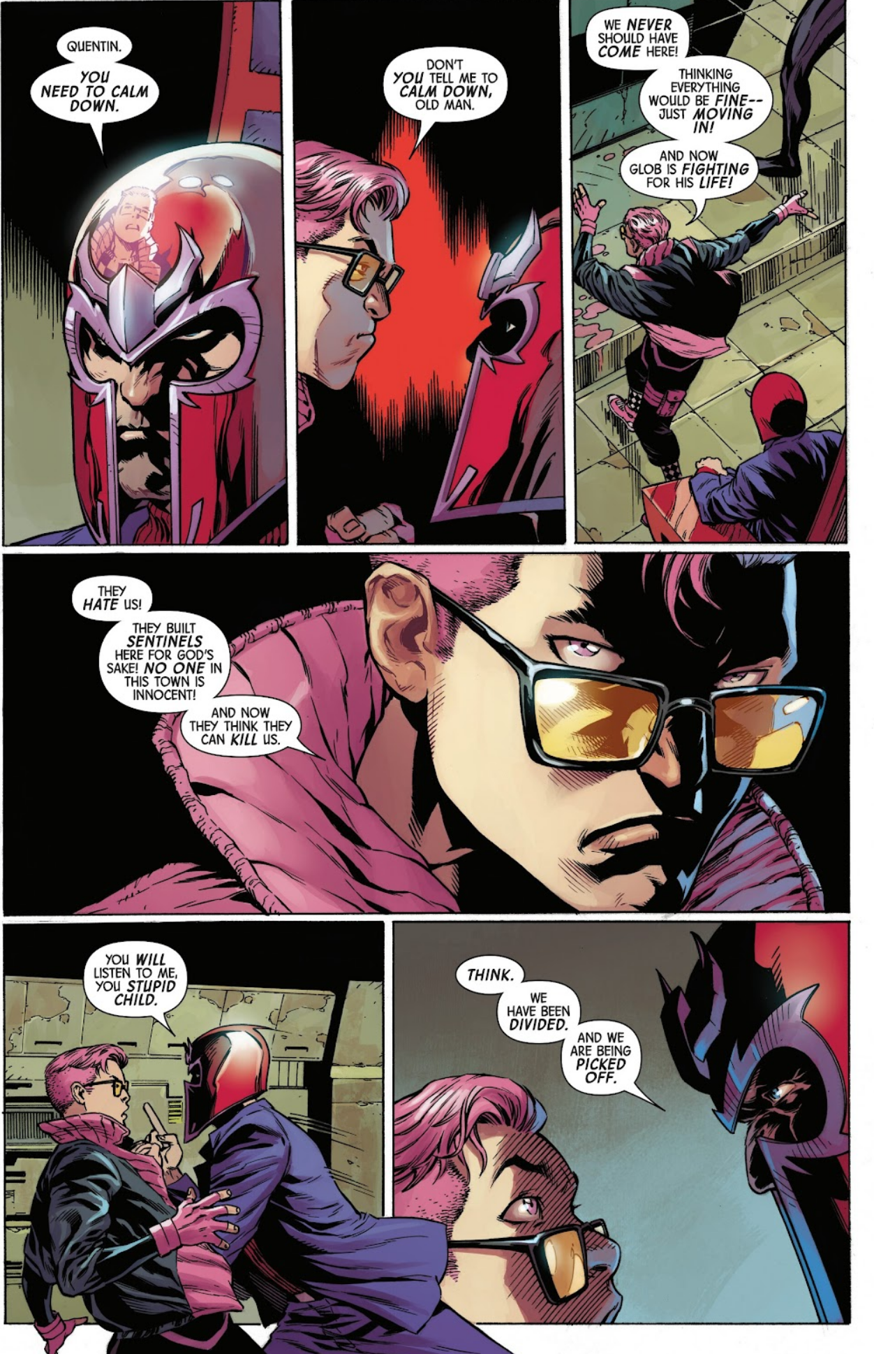 X-Men #28 begins with the X-Men still in the Factory base in Merle, dealing with the fallout of Glob Herman being shot. With their comrade fighting for his life, Quinten Quire and Temper storm out to seek retribution, despite Magneto’s protests and pleas for them to remain calm. The hot-blooded mutants have a long history with Glob, one that Jed MacKay recounts from the days of Jason Aaron’s Wolverine and the X-Men comic run. Unfortunately, their brash actions play right into the Danger Room’s hands.
