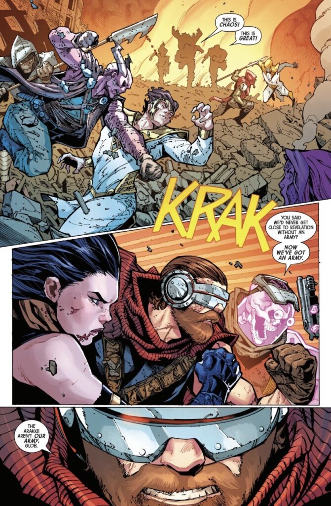 Regardless, with Revelation committed to his motives, the Arakko forces make short work of Revelation’s Choristers and Seraphim, while the X-Men encounter Wolverine, who, thanks to the events of The Last Wolverine, has awoken from his brainwashing and can now resist Revelation. The former Angel of Death is now intent on killing his former master, and there’s an enjoyable page featuring him and Cyclops greeting one another in the stoic, gruff way their characters should.