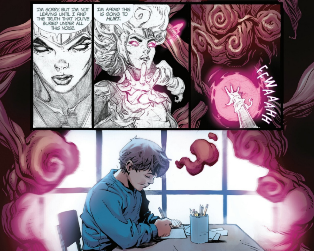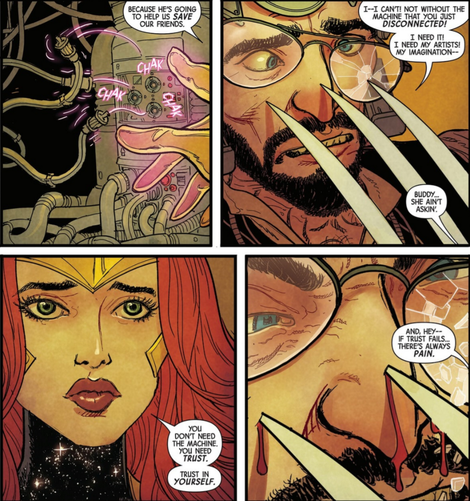 Phoenix learns that the Creationist, or Bobby, was once a student at Xavier School, who quickly lost faith in himself and left the school. Delving deeper reveals childhood trauma related to his mother denying both his mutant heritage and his artistic desires. A beautiful sequence ensues, with Phoenix and Wolverine entering the Creationist’s mindspace as drawings before emerging in his lair.