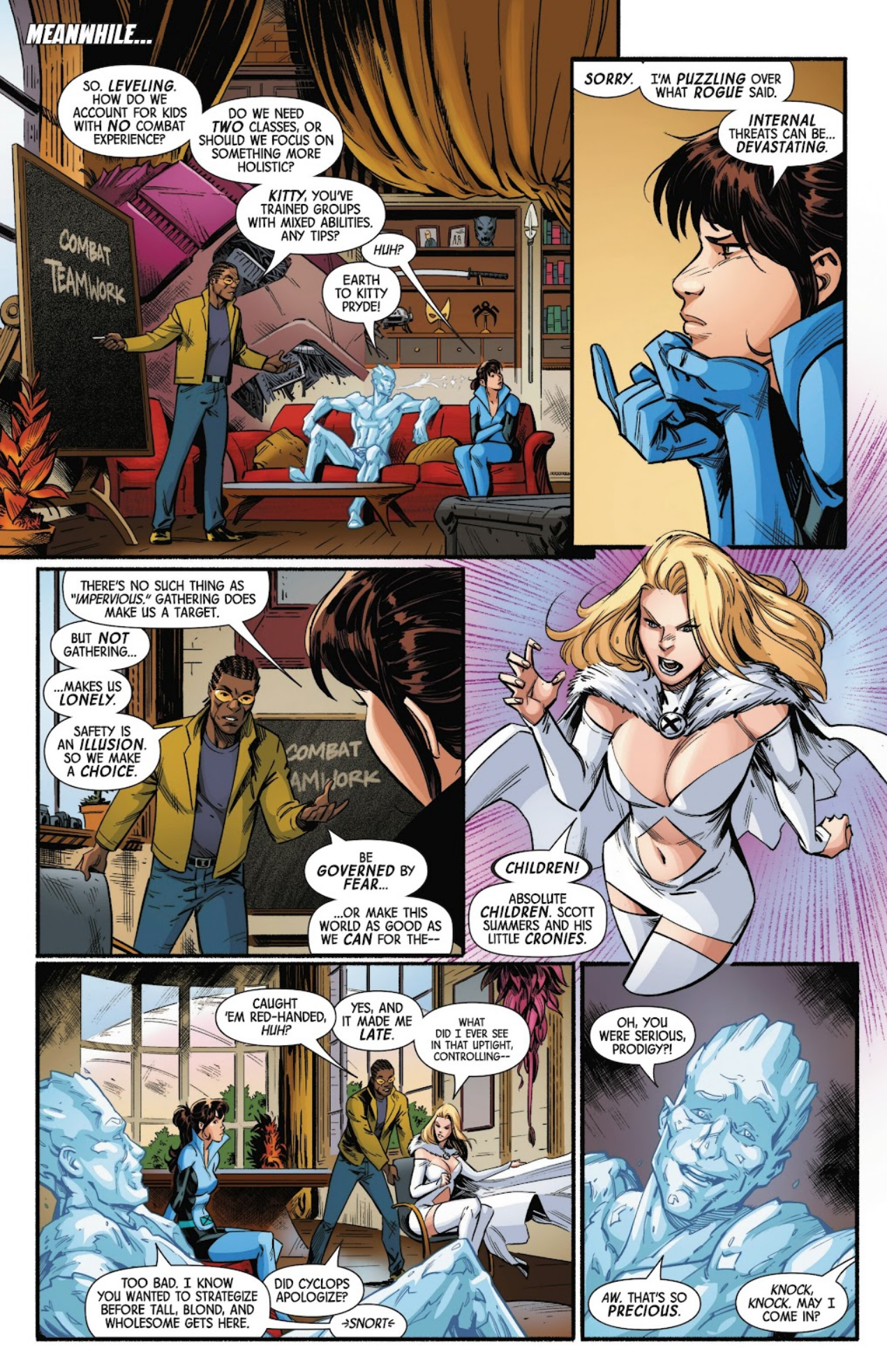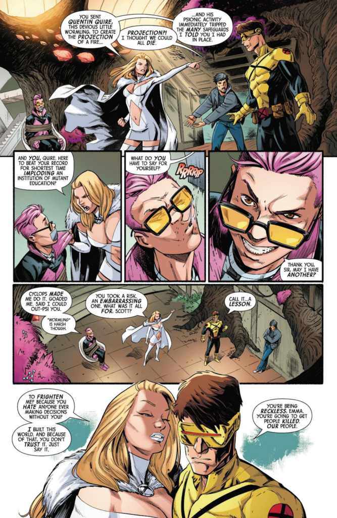 Cyclops defends his actions, while Emma is irate at him for lacking trust in her and finding him controlling, uptight, and arrogant. It’s an effective argument; one made plausible by the bitter relationship between the two characters. While some writers have attempted to portray them as friends, Cyclops and Emma are more naturally adversarial in many ways, given their respective senses of pride.