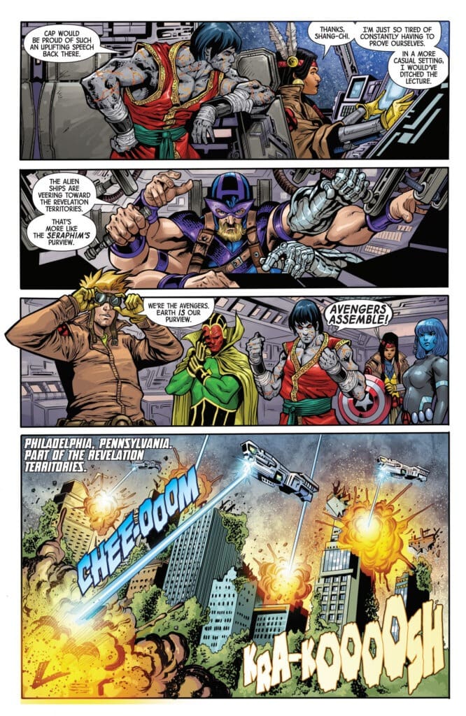 In this Age of Revelation, the X-Vengers still fight for the world, thwarting a Kree attack, despite the citizens of the free United States not being particularly trustful or grateful. The issue is tinged with sadness and mingled with hope; there is an enormous sense of loss that informs each of the characters, but also a sense of duty and responsibility to carry on living, to carry on fighting. It is there where the story is most effective.